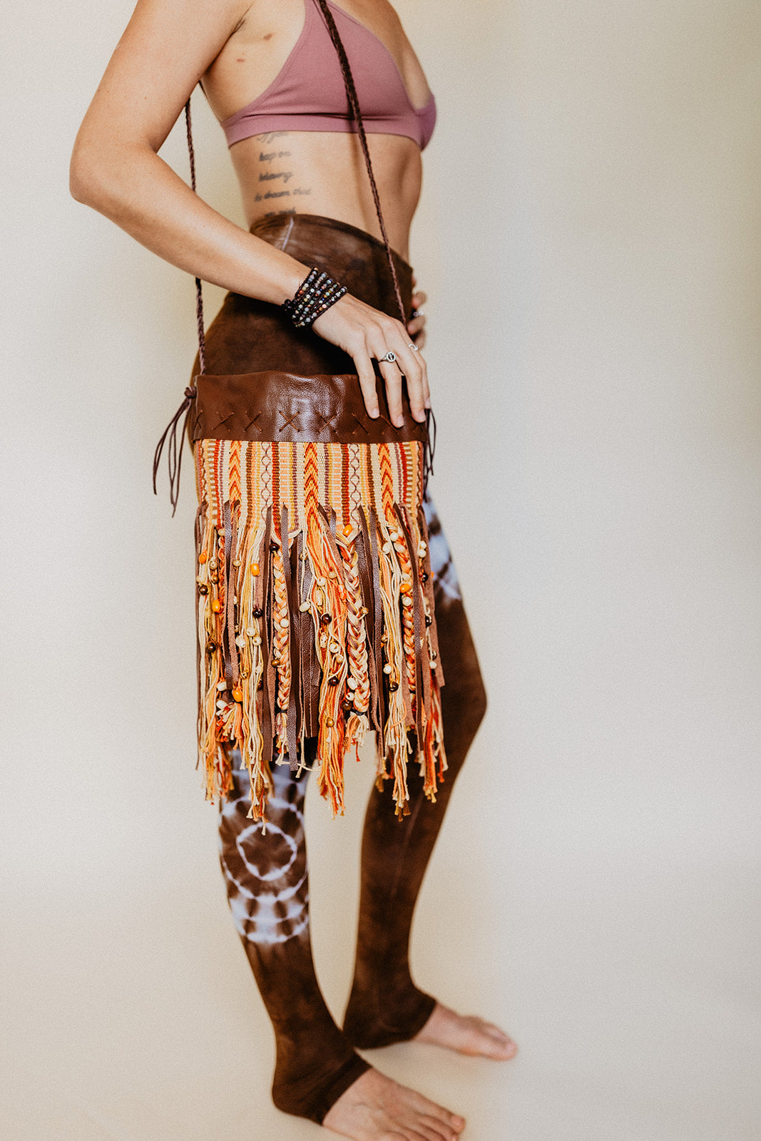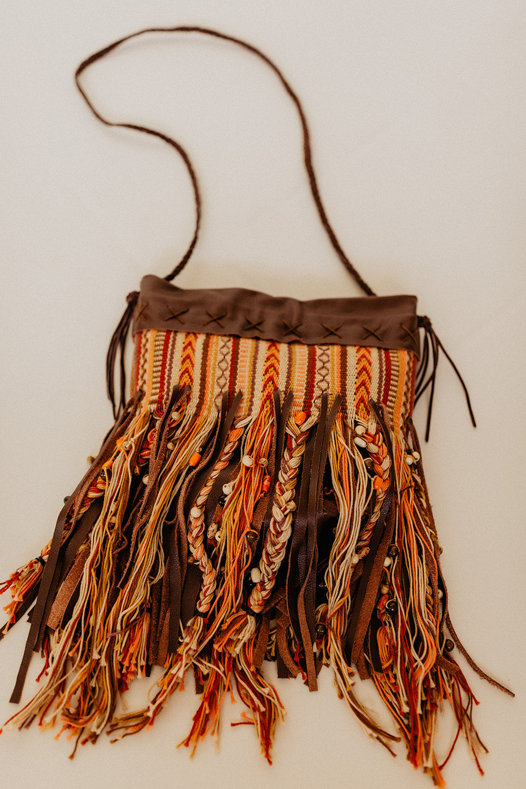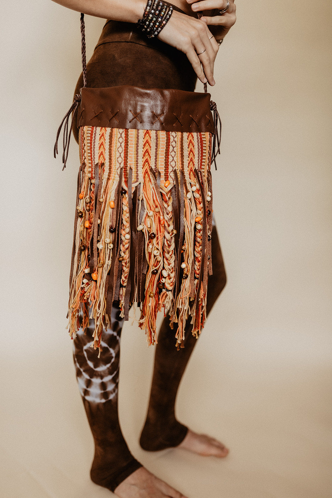 The Gypsy Crossbody Bag is 100% handmade with time and love. These bags are first handwoven with luxurious mercerized cotton yarn to be paired with genuine leather, a linen interior, hand stitched details, and wooden bead accents. These bags are made using all natural materials by hand in the USA. Countless hours of weaving, sewing, stitching, beading, and braiding go into this unique and one of a kind work of art.